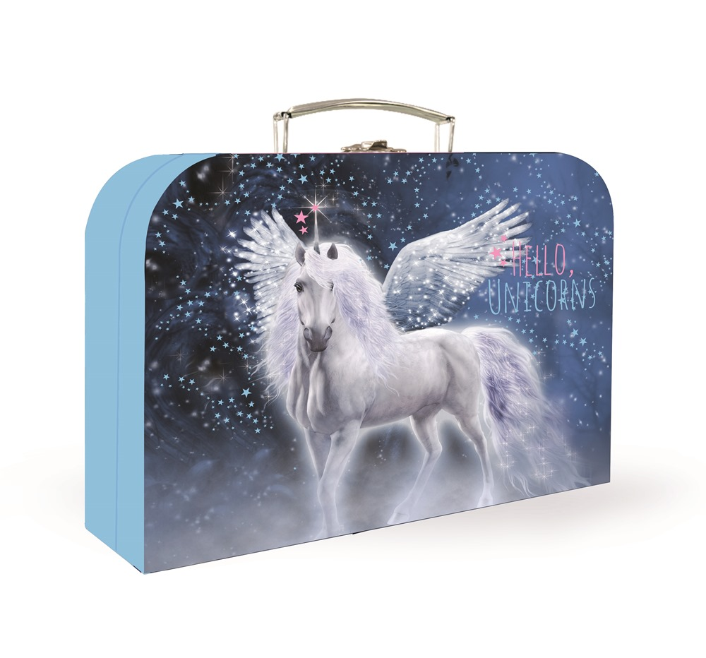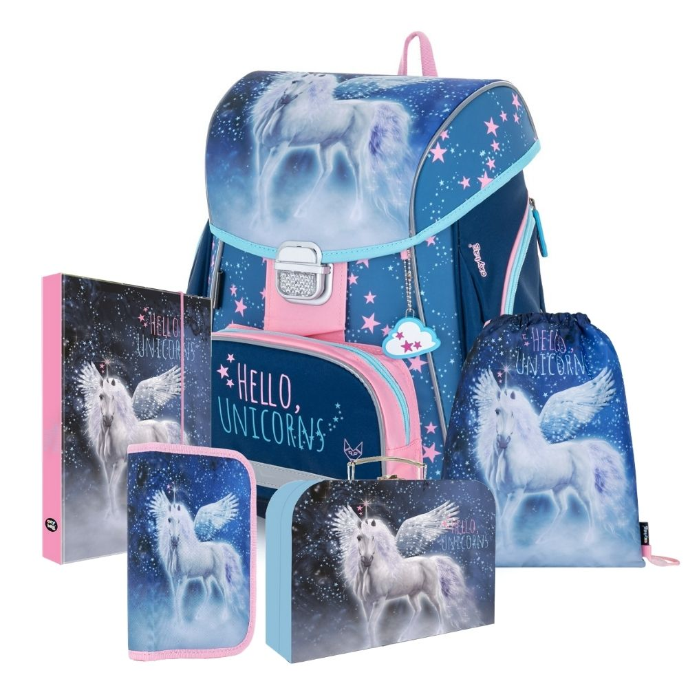 Školní set pro prvňáčka s motivem jednorožce. Set obsahuje školní batoh Premium, sáček na cvičky, prázdný jednopatrový penál, kufřík a box na sešity A4.