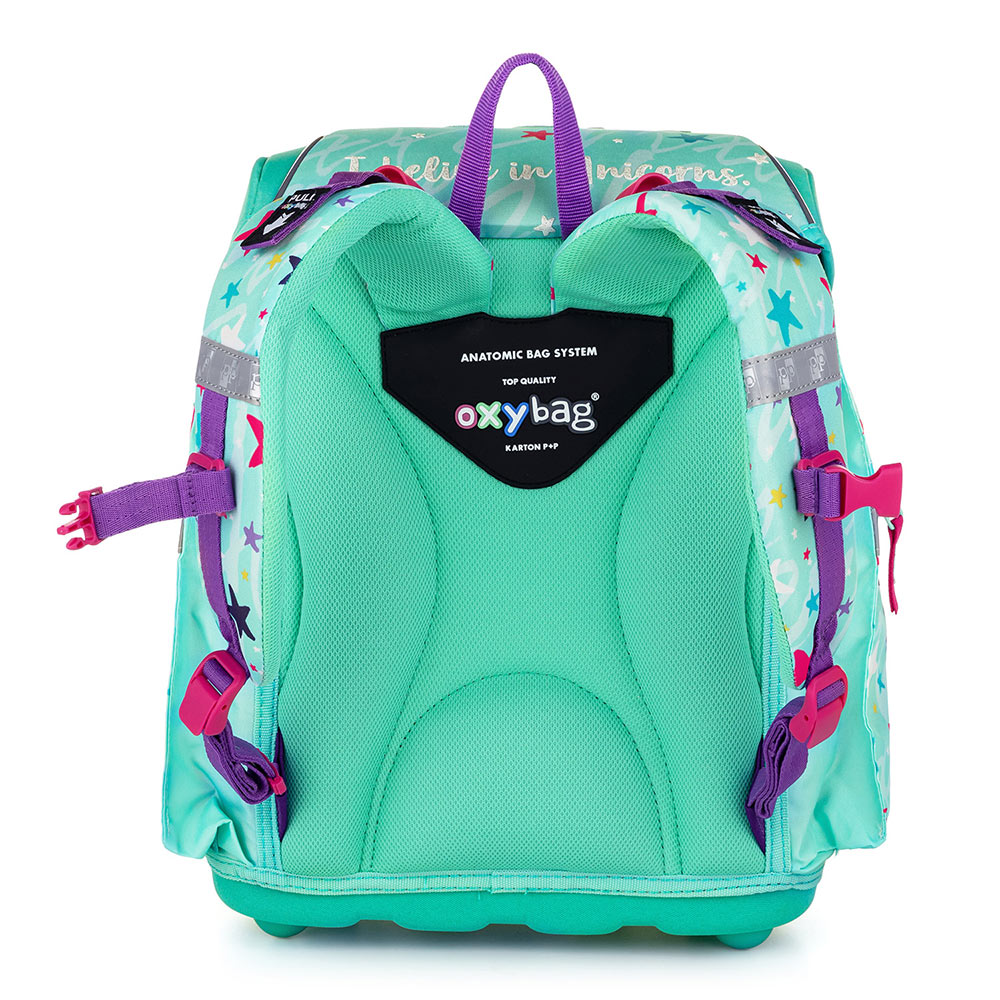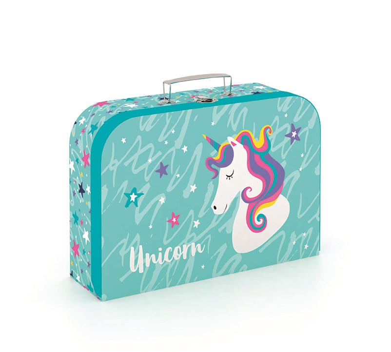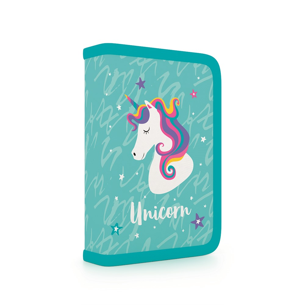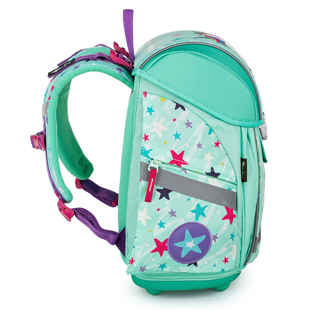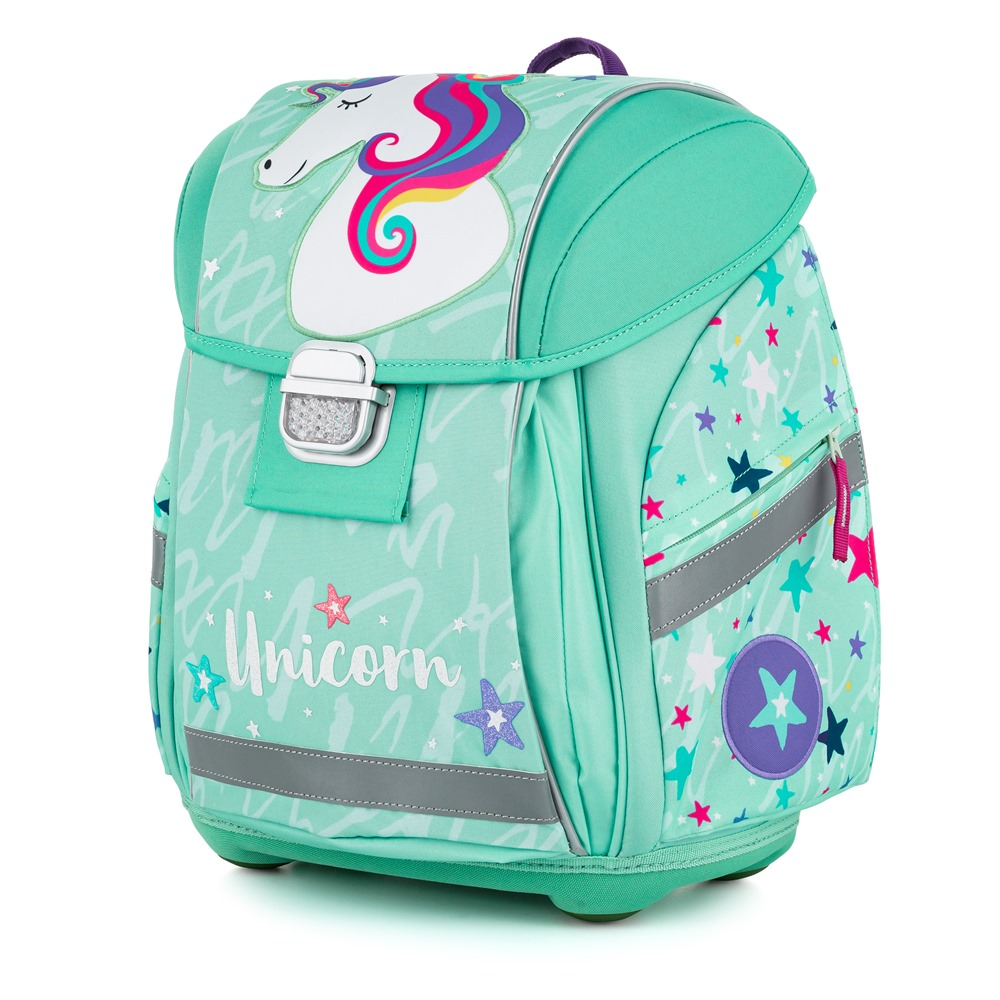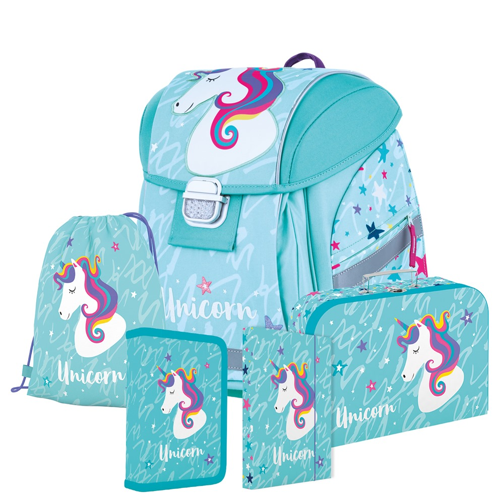 Školní set pro prvňáčka s motivem jednorožce. Set obsahuje školní batoh Premium Light, sáček na cvičky, naplněný jednopatrový penál, kufřík a box na sešity A4.