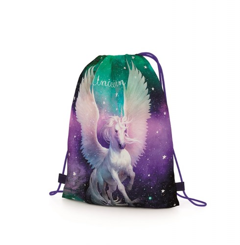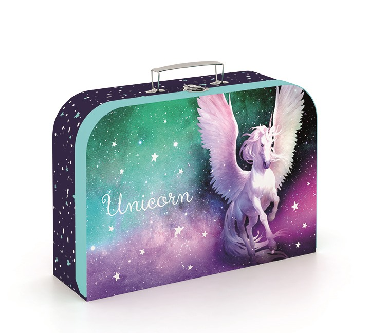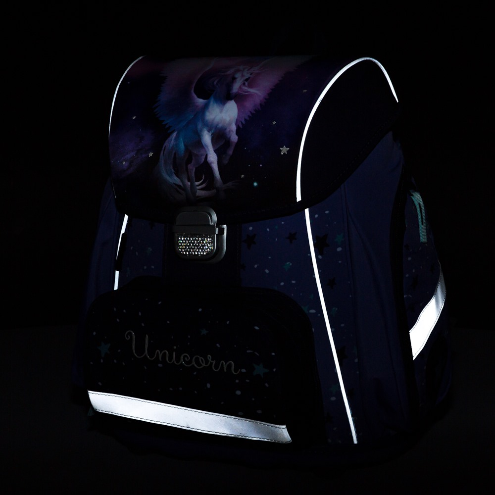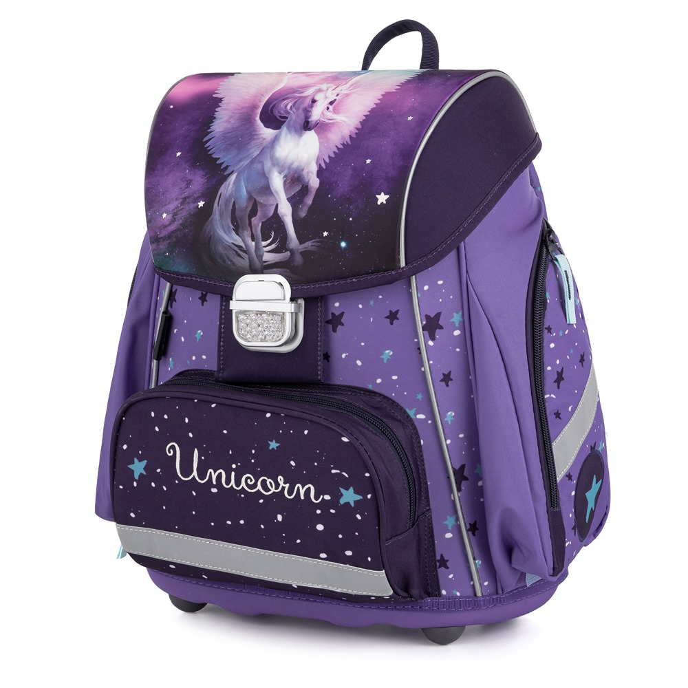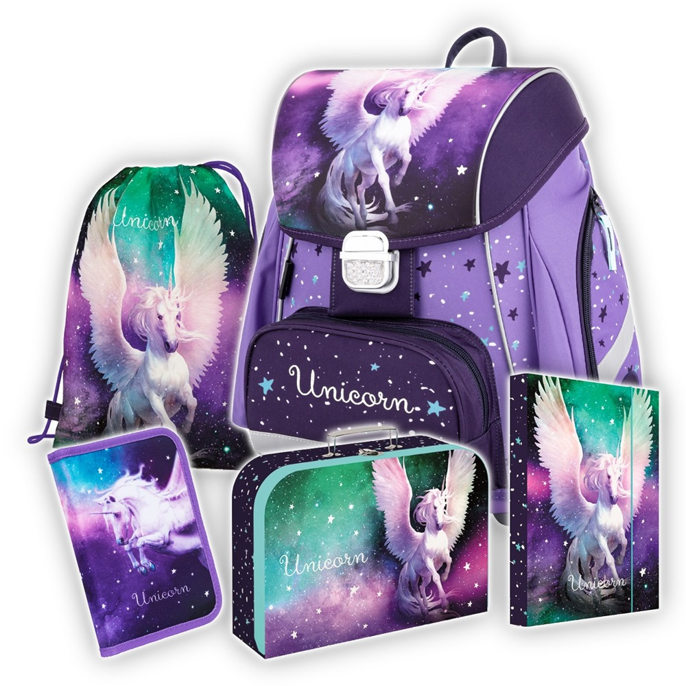 Školní set pro prvňáčka s motivem jednorožce. Set obsahuje školní batoh Premium, sáček na cvičky, naplněný jednopatrový penál, kufřík a box na sešity A4.