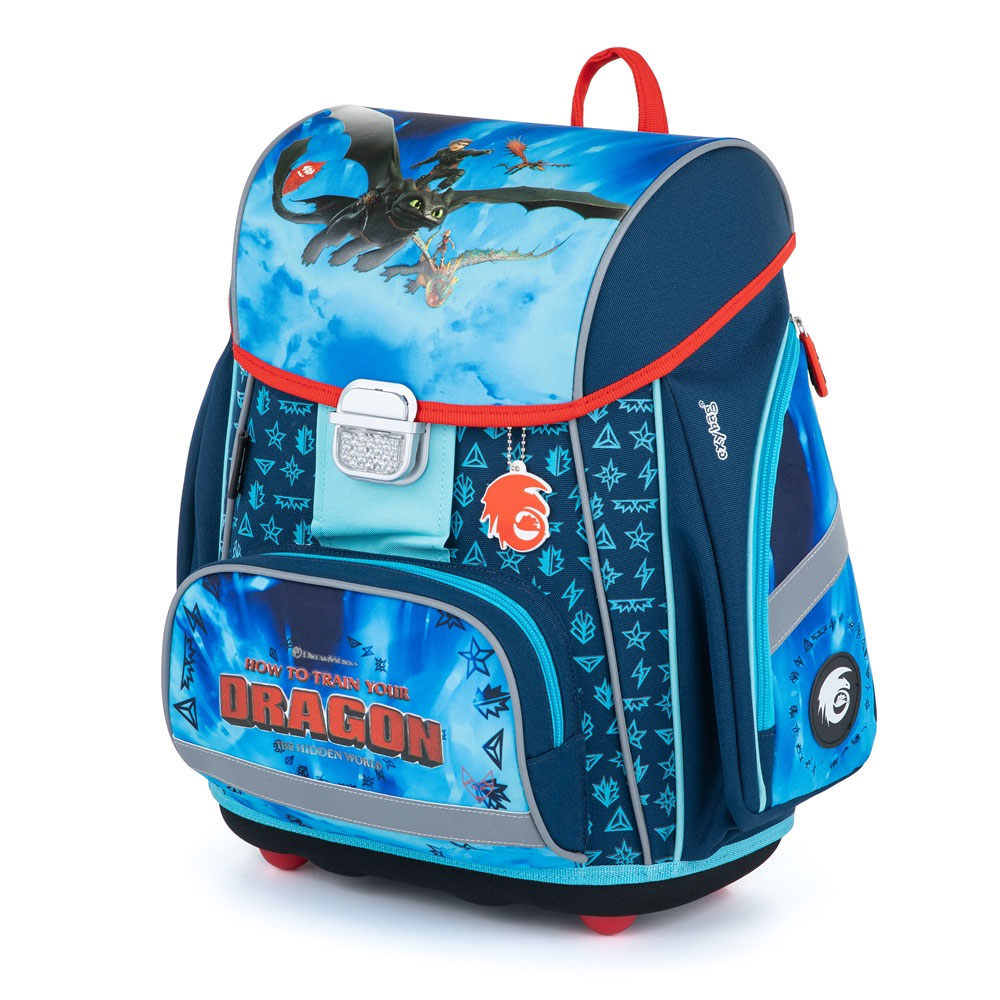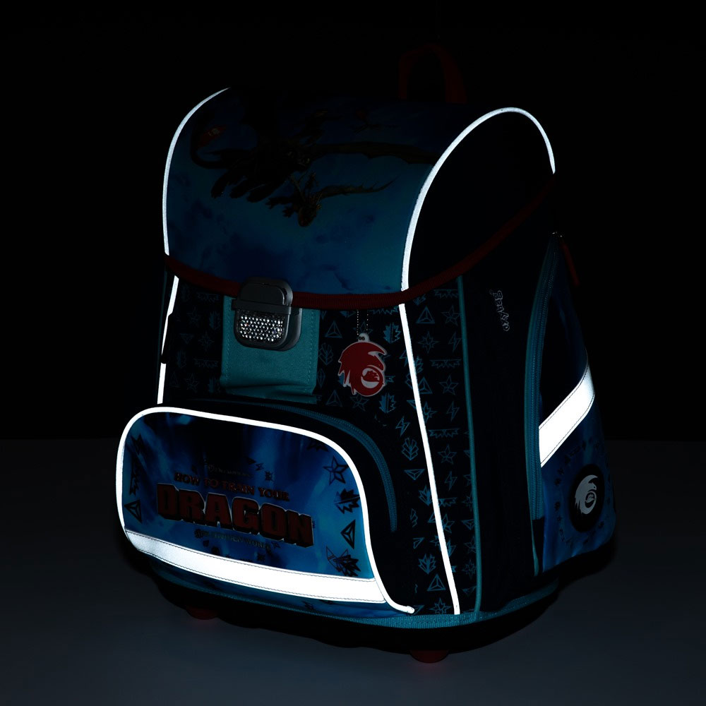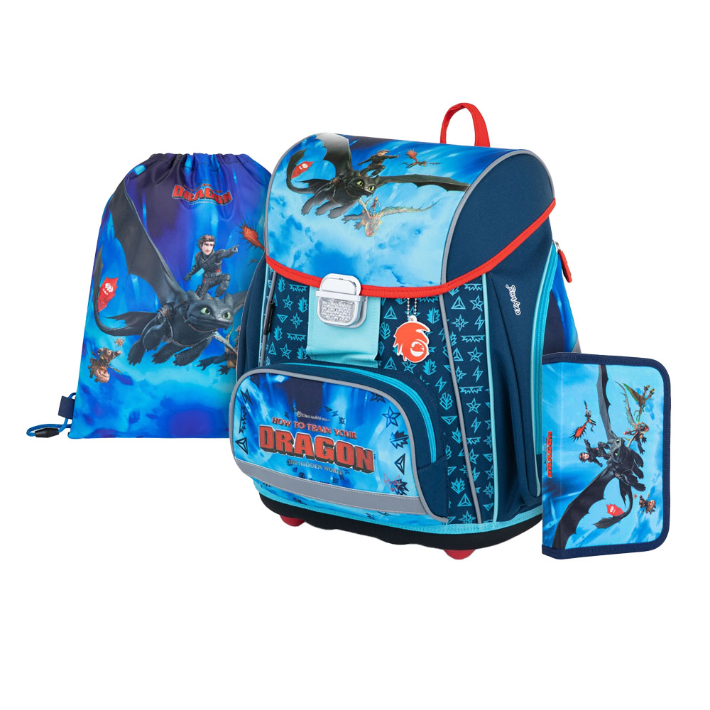 Školní set pro prvňáčka s motivem Jak vycvičit draka. Velký set obsahuje školní batoh Premium, prázdný penál, sáček, zástěru, kufřík, láhev na pití a desky na sešity A4, A5.