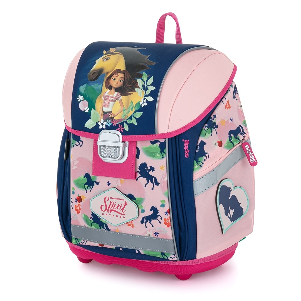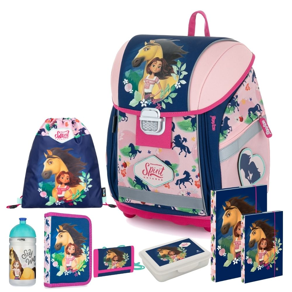 Školní set pro prvňáčka s motivem Spirit Riding Free. Velký set obsahuje školní batoh Premium Light, prázdný penál, sáček, peněženku, box na svačinu, láhev na pití a desky na sešity A4, A5.