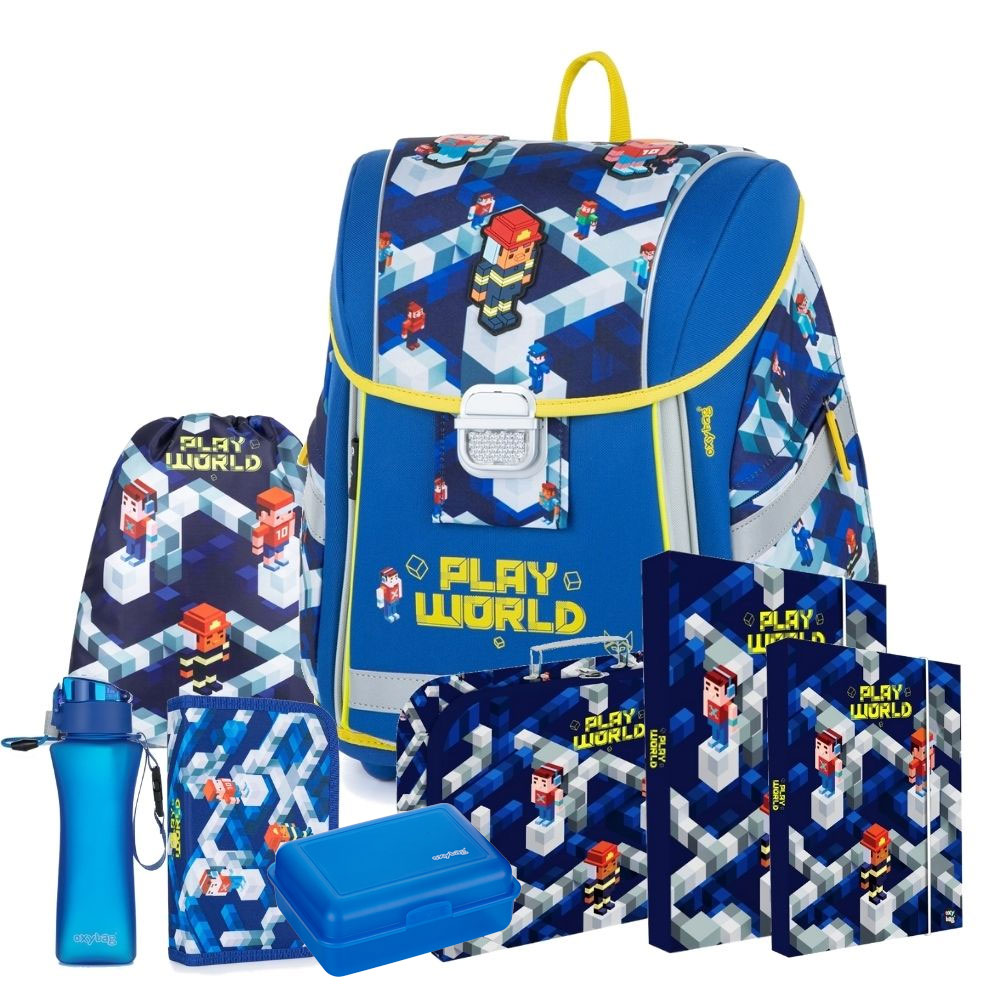 Školní set pro prvňáčka s motivem Playworld. Velký set obsahuje školní batoh Premium Light, prázdný penál, sáček, kufřík, láhev na pití, box na svačinu a desky na sešity A4, A5.